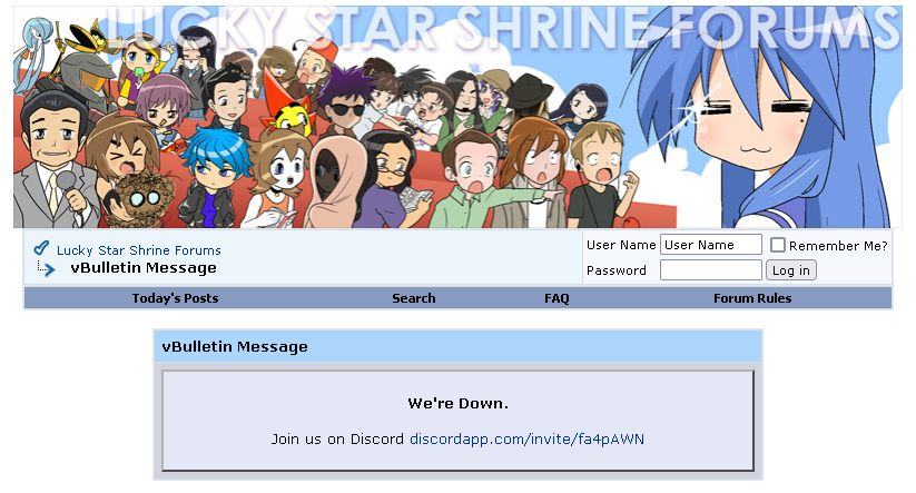 The Lucky Star Shrine Forums is now a relic of the past. Thousands of posts now gone, and moved to a Discord that will soon be in the same situation. What was once a community on the clearnet is now relegated to the walled garden of Discord.